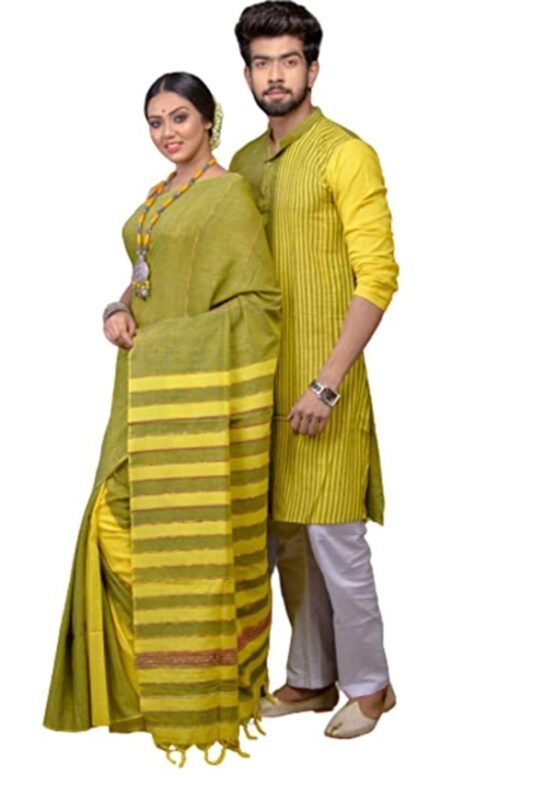 Mahi Fab Handloom Pure Cotton Saree-Kurta Couple Set Colour- Yellow